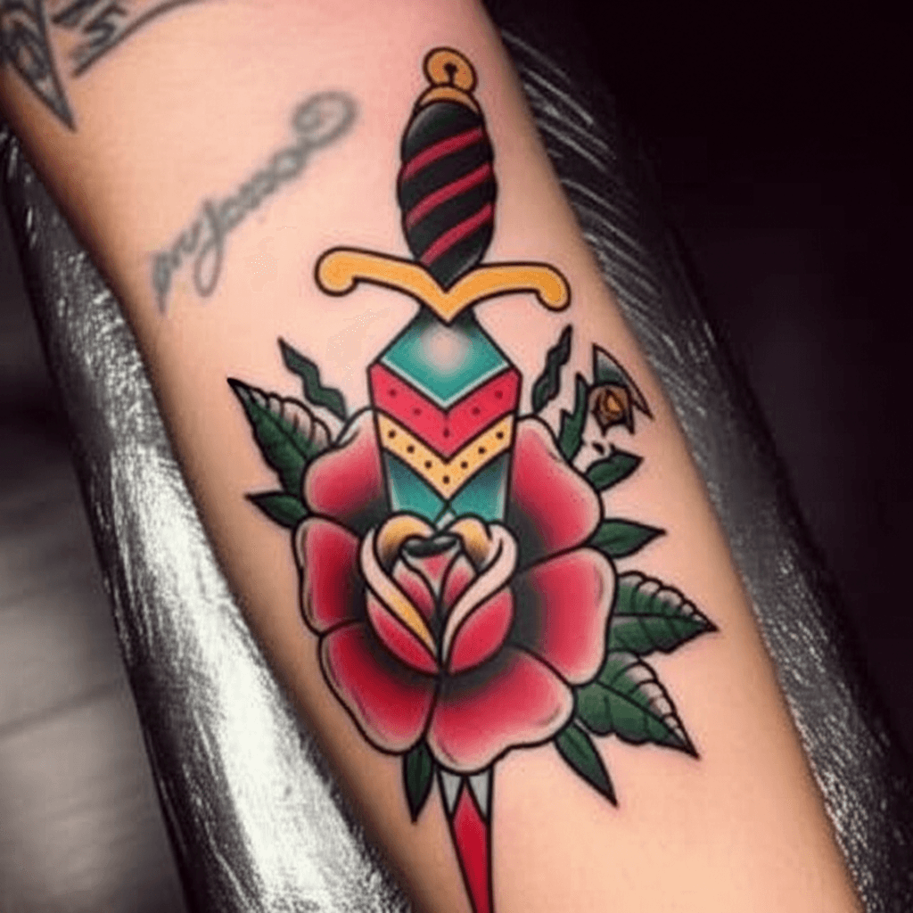 腕に施した、リアルなオールドスクールの薔薇と短剣のタトゥー。鮮やかな彩色が特徴です。