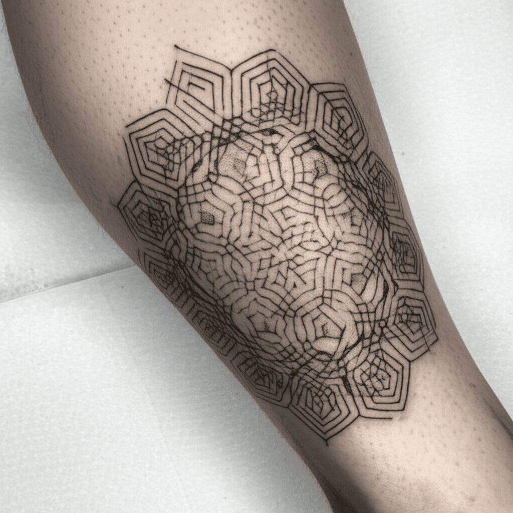 前から幾何学模様が好きで、シンプルだけど奥行きのあるデザインを探していました。神聖幾何学は神秘的な雰囲気もあるけど、デザイン自体が洗練されていて気に入っています。 脚の見える部分に彫りたかったので、大きすぎず小さすぎない、バランスの良いサイズ感にしました。完成したタトゥーは想像以上に綺麗で、見ていると心が落ち着きます。 長く付き合っていけるデザインを選んだつもりです。