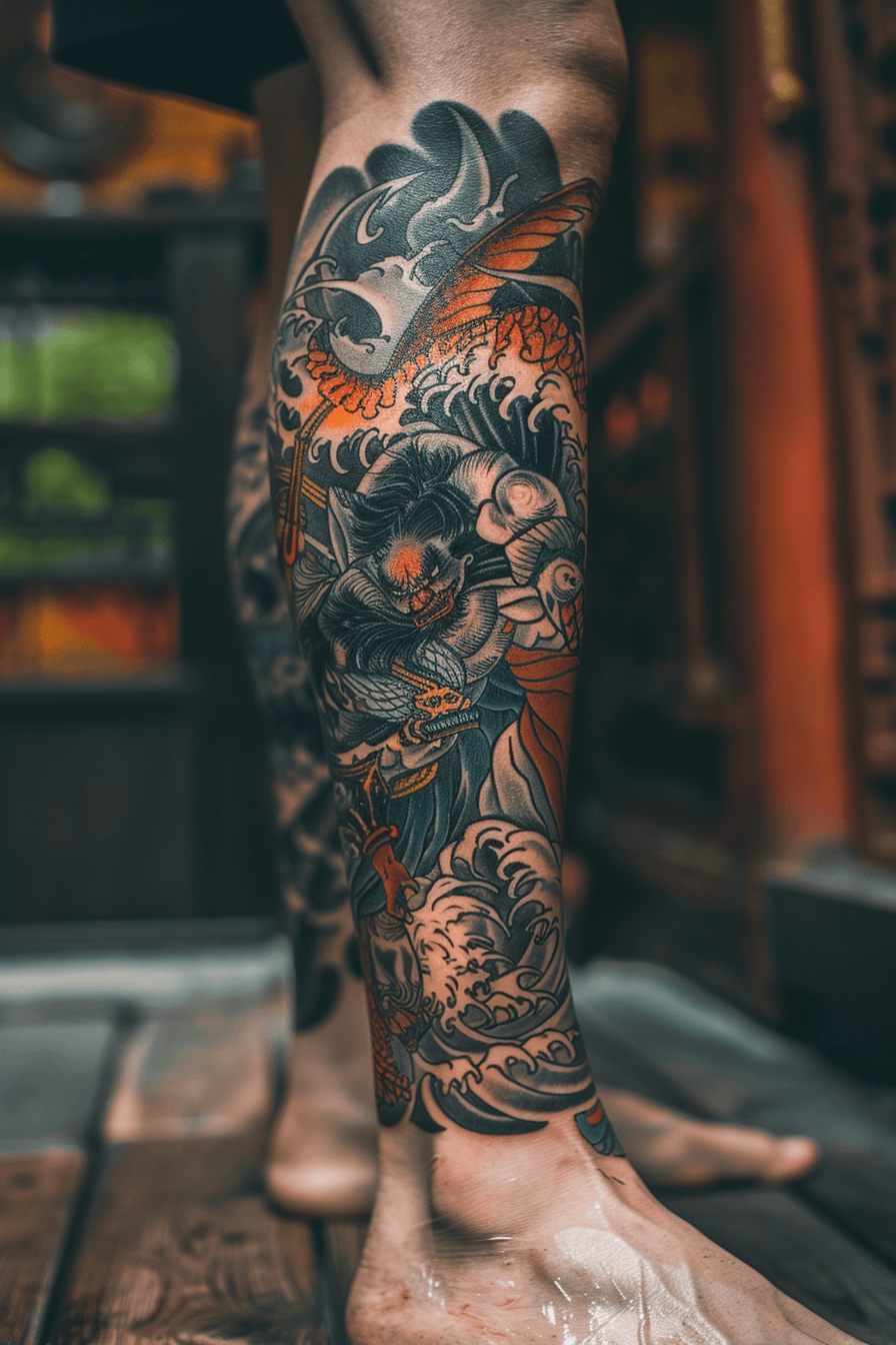 荒々しい波間から現れる鬼神。鋭い眼光と舞い散る髪が迫力満点で、背景には力強く舞う朱色の鳥と荒波が描かれています。和彫りらしい力強いラインと鮮やかな色彩が、足全体に物語を刻み込んでいます。